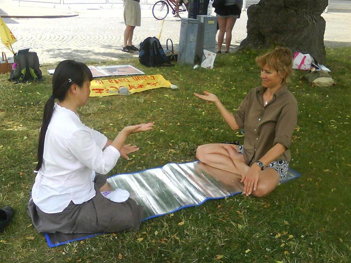 学员们碰到了一对中国厦门移民来哥特兰岛的母女,她们开了一个便利食品亭,学员送给她们法轮功中文真相小册子和退党特刊,向她们讲天安门自焚伪案的真相。最后一天,学员还专门送去一份《九评共产党》。