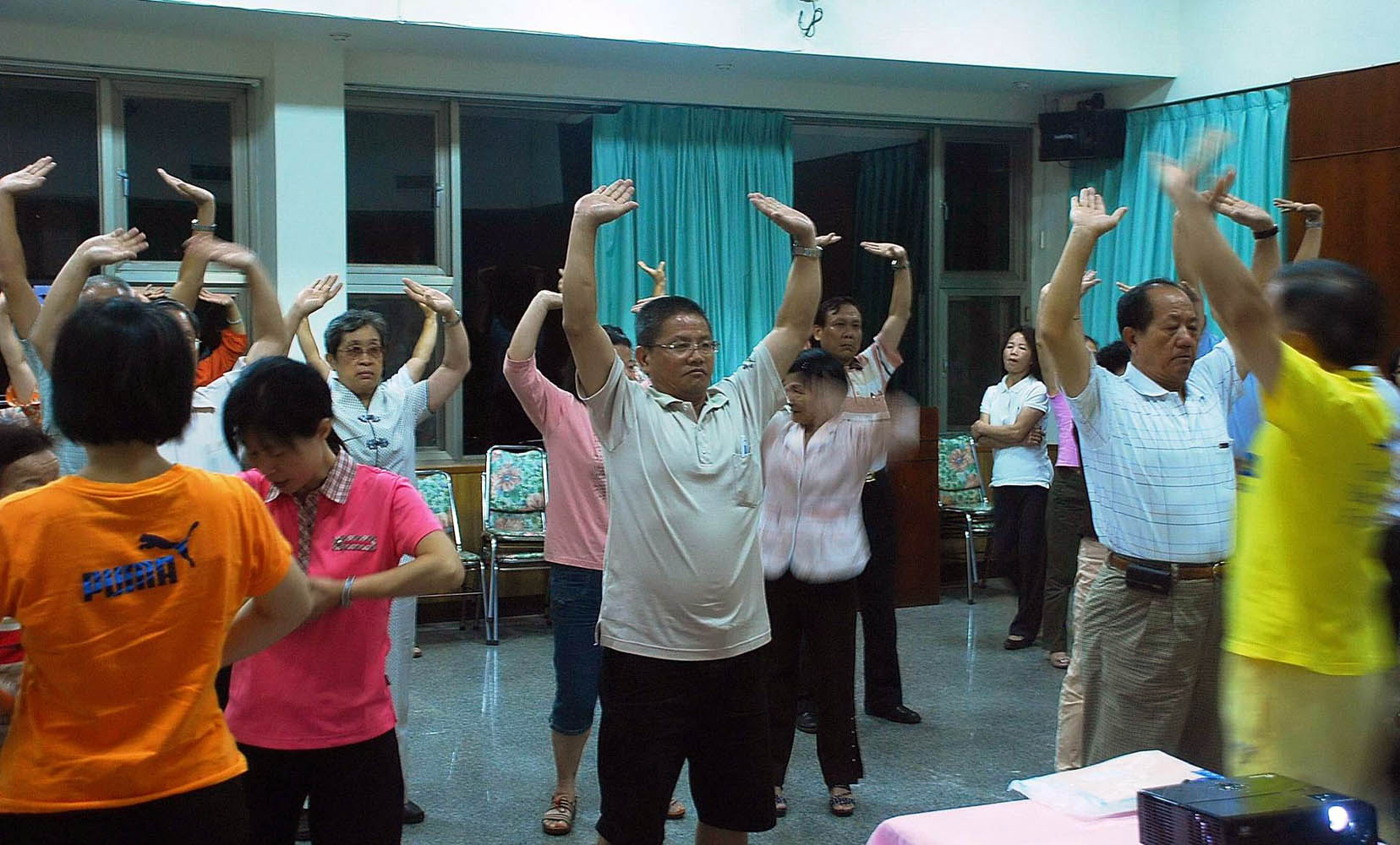 ![]() 民众学炼法轮功五套功法,中间戴眼镜者为童年度假村董事长陈明贤 |