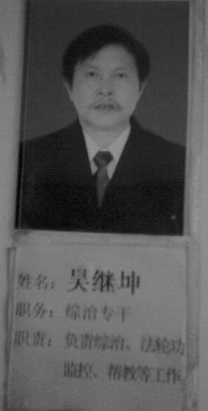 二零零零年三月早上九点多钟,吴继坤纠葛一伙人把大法弟子罗菊凤强行绑架到城镇派出所。当天送拘留所,非法关押十五天。二零零三年七月,以有人举报大法弟子罗菊凤散发真相资料和讲真相为借口,吴继坤、姚本鑫、杨丽琴等四人,把罗菊凤用暴力拖上警车送看守所关押迫害,罗菊凤在劳教所被迫害的双目失明,直至现在。二零零六年六月二十七日,在罗菊凤双目失明,走路、做事都无能力的情况下,新晃城镇兴隆乡政府纠葛一伙人破门而入,闯进屋里将罗菊凤捆绑到怀化市洗脑班。吴继坤参与监控。