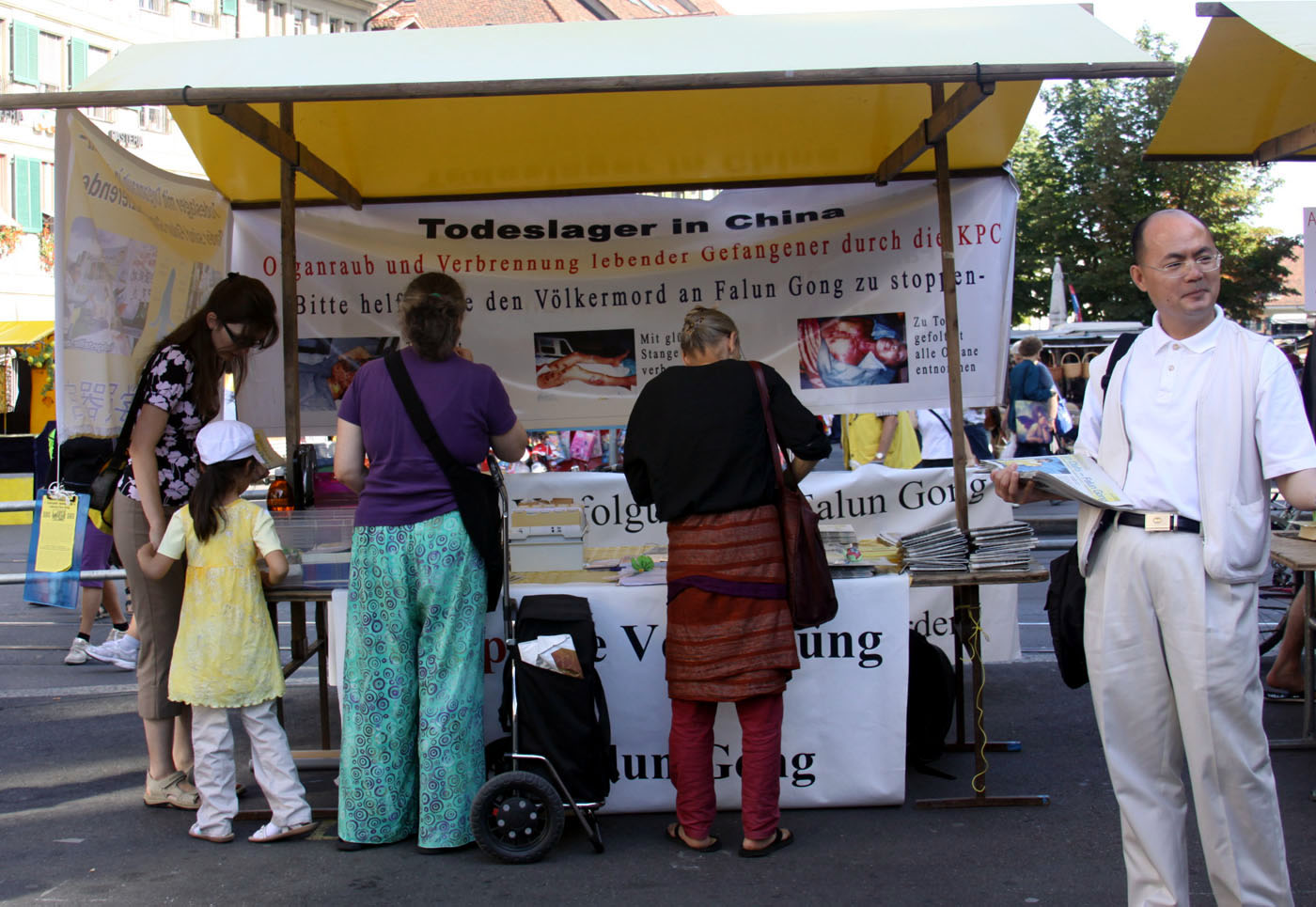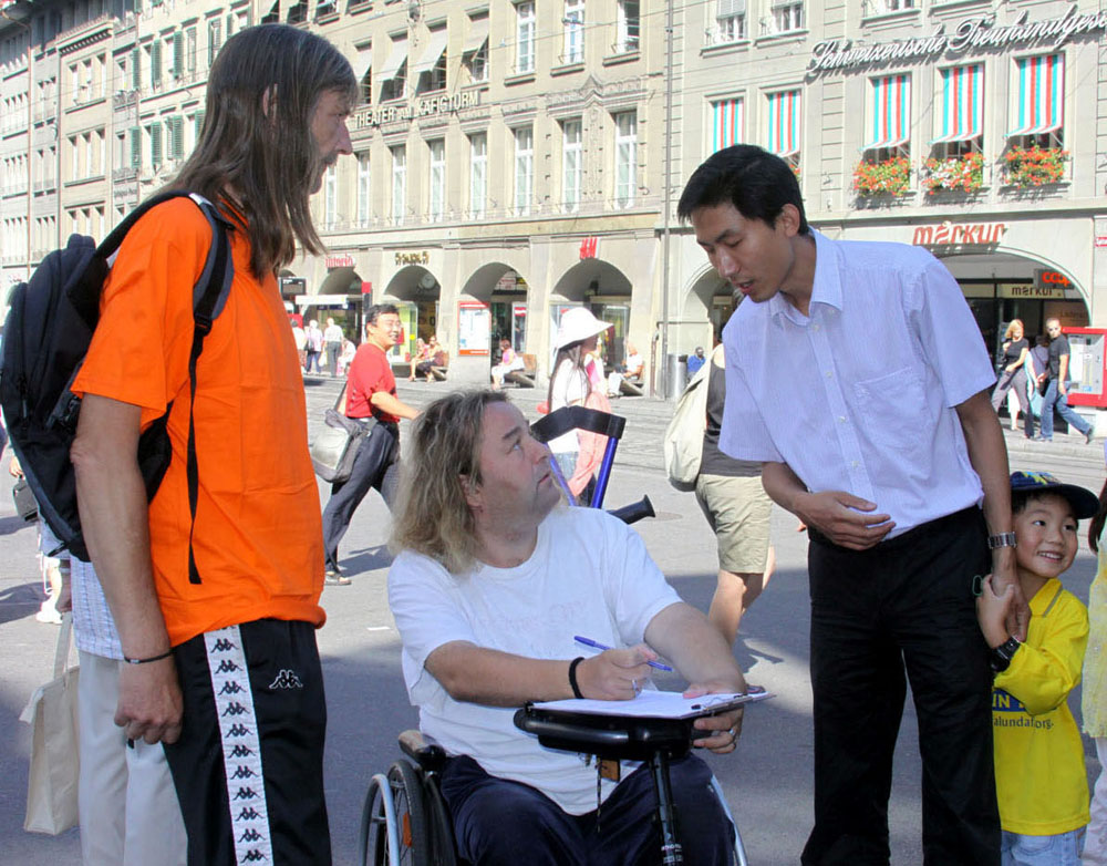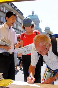 ![]() 瑞士法轮功学员在首都伯尔尼设信息摊位揭中共恶行。 |