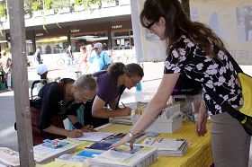 一位定居瑞士的韩国中年妇女来到摊位前向学员了解真相,她说曾经在当地的报纸上,看到过关于法轮功被迫害的消息,但是很简短。学员告诉她,因为中共把魔爪伸向海外,西方主流媒体为了与中共做生意,很少报道法轮功被迫害的真相。