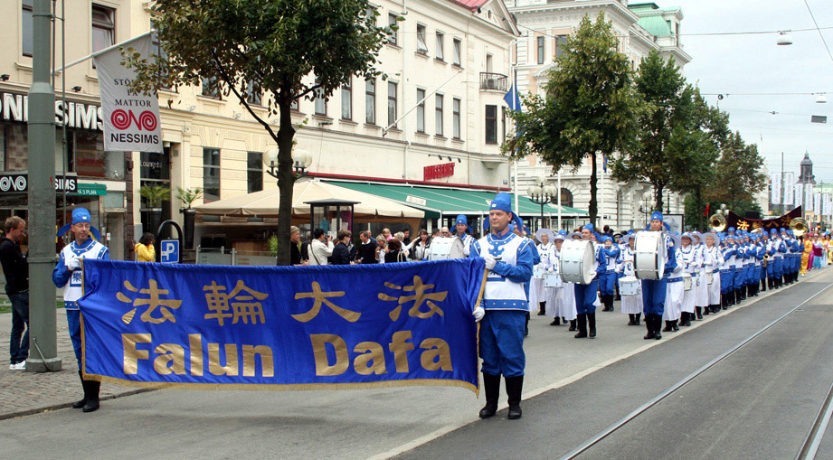 法轮功学员的游行队伍经过哥德堡的最繁华地区。尽管天上下着阵阵小雨,人们依然纷纷驻足观看游行;欧洲天国乐团的演奏更是吸引了四面八方的民众。很多游人从而有机会了解有关什么是法轮功、及中共迫害法轮功的真相。