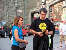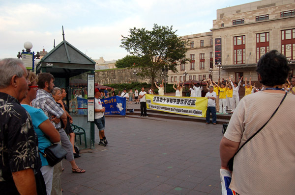 当天的集会设在魁北克市旅游景点,位于市中心的魁北克省议会大楼附近的优维尔广场(place D'Youville)。人群如潮水般地涌来,倾听真相、取阅传单。现场互动频频,不少围观者对每一位演讲者的发言都报以热烈的掌声。