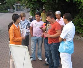 二零零九年八月十四日下午,德国北威州(Nordrhein-Westfalen)多特蒙德市(Dortmund)法轮功学员来到城市公园(Stadtgarten)炼功,悠扬的炼功音乐和舒缓的动作吸引了很多德国人。几个年轻人坐下来和法轮功学员一起学习打坐,这种来自中国的传统的修炼引起了他们很大的兴趣。
