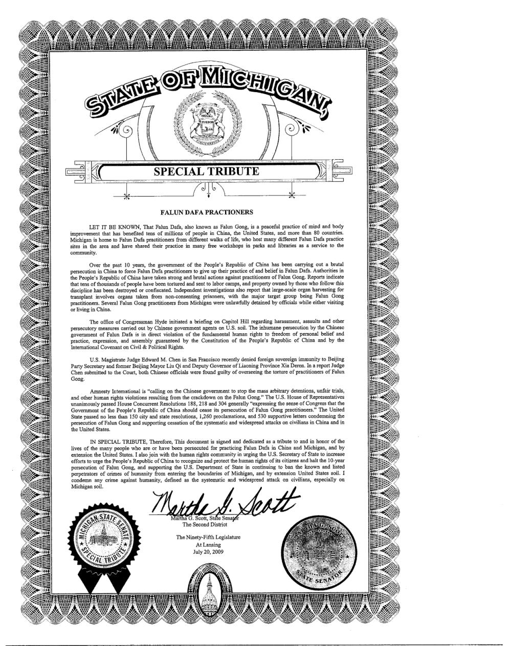 有鉴于此,我特签发此文并将此文作为对那些在中国和密歇根州以及全美国因修炼法轮大法而被中共迫害的人们的一种礼赞,并向他们表示特别敬意。我也将和人权组织一起敦促美国国务卿加大力度促使中华人民共和国承认并保障中国公民的人权,停止对法轮功进行的长达十年之久的迫害。同时,我要支持美国国务院继续禁止那些已知的和在册的人权迫害者进入密歇根境内,以至于踏上美国土地。我对任何侵害人性,特别是在密歇根土地上系统而普遍地攻击平民的犯罪行为表示谴责。