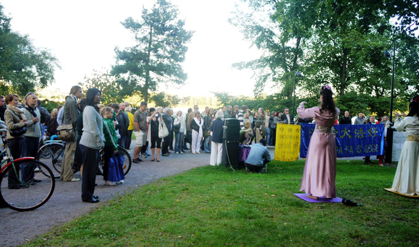 热闹非凡的公园里,虽然各种文化艺术活动名目繁多,法轮功学员的活动却俨然成为一道靓丽的风景线。学员们在优美的音乐声中演示的五套功法,吸引了很多人驻足观赏。人们纷纷拍录下这祥和的画面,接过学员递上的资料,或与学员交谈。他们赞叹:“很美”、“很祥和”,还有人建议学员到赫尔辛基各处去进行展示。
