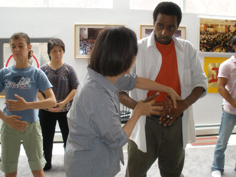 ![]() 为参加九讲班的新学员调整炼功动作 |