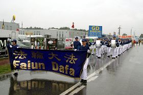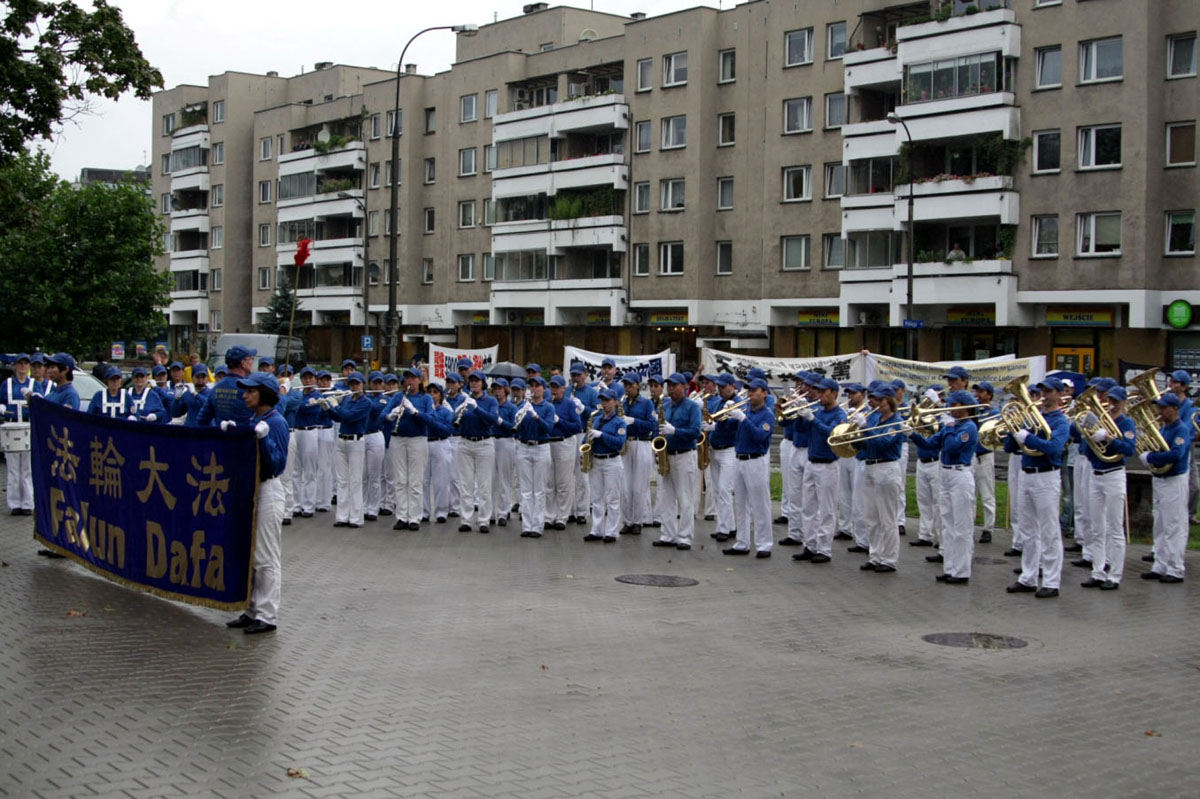 这一天,华沙上空阴云密布,随着天国乐团的演奏开始,豆大的雨点同时从天而降,但这丝毫没有影响队伍的行进和乐队的演奏。大雨虽然让人们只能隔窗相望,但人们都听到了《法轮圣王》、《法轮大法好》、《法正乾坤》、《送宝》等乐曲声。
