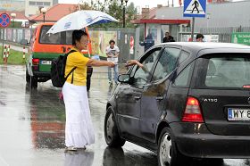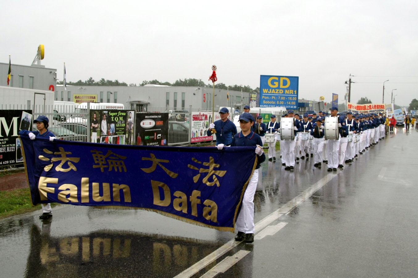 八月二十九日中午,波兰首都华沙郊区Wolka Kosowska中国商贸城唯一一条大道上,欧洲天国乐团成员身着清新的蓝白服装,步伐一致,演奏起气势恢宏的乐曲,给那里的中国人、越南人、土耳其人、印度人和波兰人带来了“法轮大法好”的福音。
