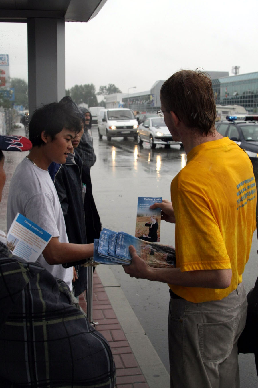 法轮功学员给过往汽车里的人发放真相资料,希望有缘人了解法轮大法的美好和发生在中国的迫害真相。长长的车队都摇下车窗,司机们伸出手臂,希望得到传单。