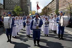 ![]() 天国乐团成员游行后向人们散发法轮功真相传单 |