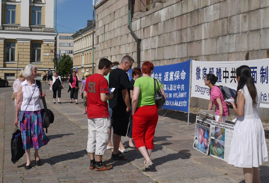 白教堂建于一八五二年,是芬兰建筑史上的杰作,也是各国游客的必到之地,常年游人众多。法轮功学员们在教堂一侧拉起了“法轮大法好”、“彻底解体中共 全面停止迫害”等横幅,并摆放了真相展板及反迫害征签本。