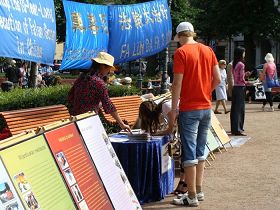 另一对夫妇站在展板前很长时间,那上面有法轮功学员在许多国家炼功的图片。 “我们知道法轮功。我们去过很多国家,都有法轮功学员。我觉得你们何不来个武装起义,把这场迫害结束了。”学员解释说,法轮功一向都是以和平的方式来反迫害,让更多的人知道真相。“这样非常好。我们是站在你们这边的。”这对夫妇表示。