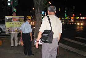 每当华灯初上,三五成群的人们便已陆续涌进夜市,随性品尝小吃美味,买些小纪念品或土产,满足之情溢于言表。随着台湾海峡两岸交流日益频繁,以及开放大陆人士来台观光,士林夜市上的大陆观光客更是络绎不绝。夜市位于承德路上大门前阶梯两侧,每晚排站着十几位法轮功学员,手举图文展板,有的机动游走分发材料,向川流不息的大陆观光客讲着法轮功真相,已经是这个知名夜市的一个特殊景象。
