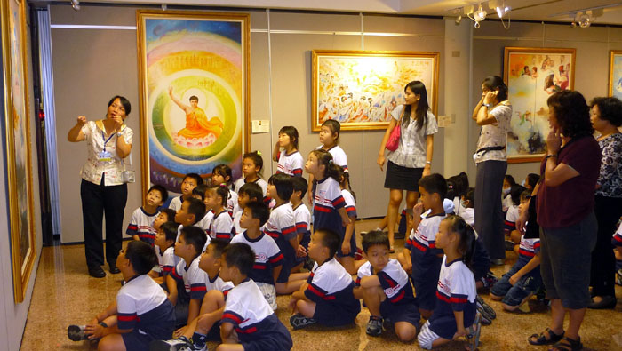 三光国小的张老师也是向阳儿童剧团的指导老师。她觉得和法轮功很有缘,看到法轮功修炼者无私地教小朋友炼功,既爱心又慈祥。当她得知这次画展时,就马上报名,希望学生们透过欣赏美的画作了解“真、善、忍”的精神。