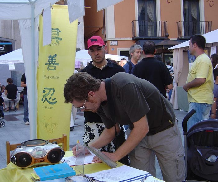 ![]() 游人在制止迫害法轮功的签名簿上签名 |