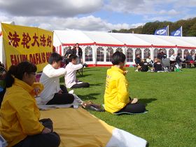 这天的天气很好,阳光明媚,学员们在优美的炼功音乐中展示五套功法。“法轮大法好”的横幅特别醒目,吸引不少人驻足观看,了解有关信息。
