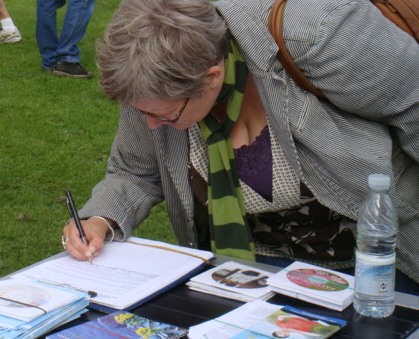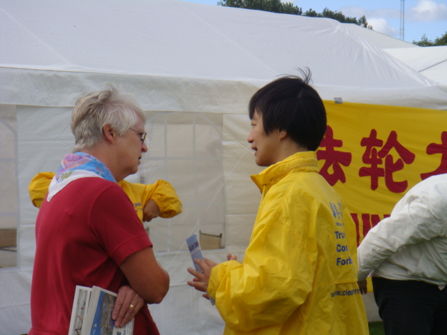 一位丹麦女士曾练过瑜伽,她向学员详细了解有关法轮功的情况,学员告诉她,“法轮功信仰真善忍,做好人,加上炼五套功法,对身体和精神都很好,能提升人的道德情操。在世界上有一百多个国家的民众炼法轮功,但是在他的发源地中国却遭到迫害。”这位女士了解真相后,签名支持法轮功反迫害,并记下联系方式,表示想学功。
