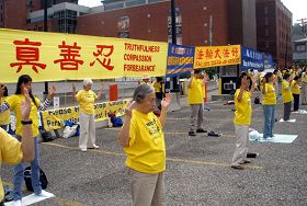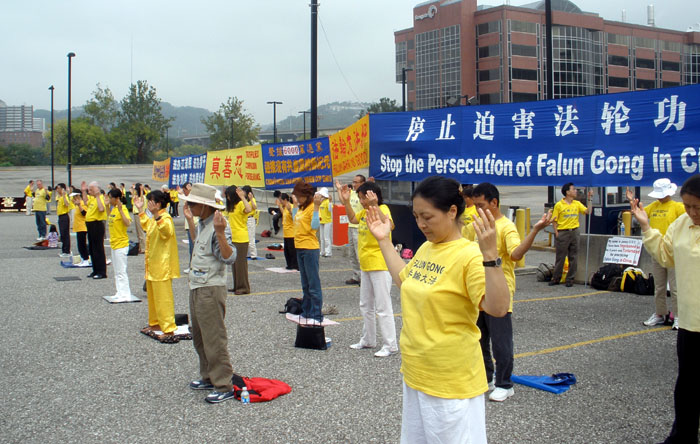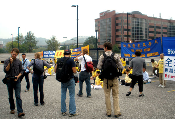 当日早上八点,中、西方法轮功学员邻近匹茨堡市国际会议中心——峰会会场外的广场上静坐炼功。他们打出:“立即停止迫害法轮功”、“法办江泽民、罗干、周永康、刘京”、“法轮大法好”和“世界需要真、善、忍”等中英文横幅,表达了在此的诉求;同时还展出了中国法轮功学员受酷刑折磨的展板,揭露中共对法轮功学员的暴行;吸引众多媒体前来采访。