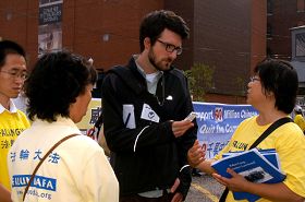 ![]() 法轮功学员在峰会会场外的和平抗议,吸引媒体前来采访。 |