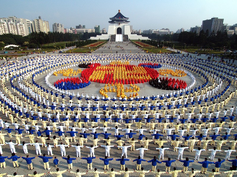 ![]() 目前法轮功已洪传到上百个国家和地区,修炼者上亿。图为台湾数千法轮功学员排法轮图形的盛大场面。 |
