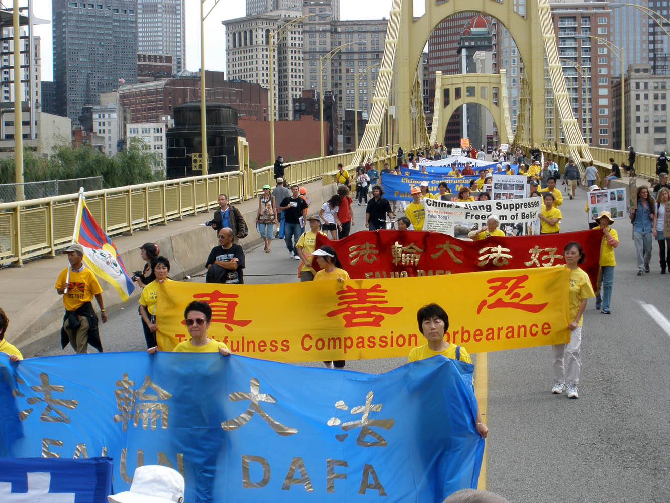 文章说,一百多名法轮功学员二十四日在匹茨堡峰会会场外的广场上集会,要求给予(中国)法轮功学员自由修炼的权利。法轮功学员从上午八点就开始举行和平抗议。他们身穿写有“法轮大法好”字样的黄T恤衫,打坐炼功。