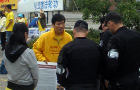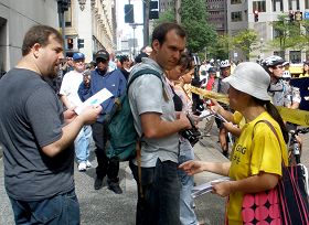 ![]() 法轮功学员向路人讲真相 |