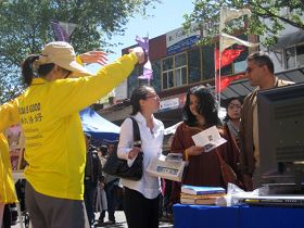 法轮功学员们在摊位上还演示五套功法和现场教功,吸引了不少游人驻足观看和学功。