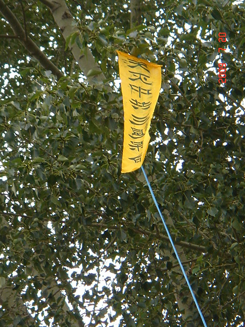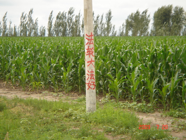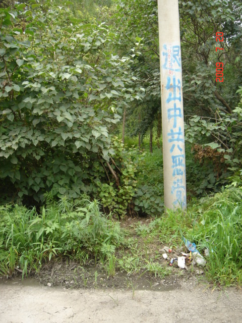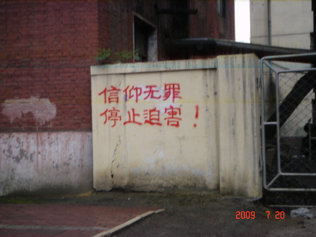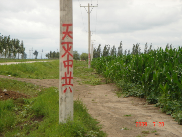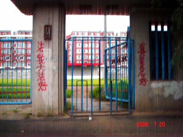 这是在大陆东北某市城乡道路两边的电线杆上、大树上、家属楼的墙上、家属楼的门上、学校周围的大树上及体育广场的立柱上等地方出现喷漆和不干胶标语:“天灭中共、退党保命”、“声援五千七百万人退党”、“驱除中共恶党,还我中华”、“真善忍好”、““法轮大法好”、“停止迫害,信仰无罪”、“平反法轮功,法办江泽民”等;