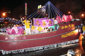 ![]() 二零零九年九月二日,台湾基隆中元祭放水灯游行,台湾法轮大法学会以明代古船造型的花车。 |