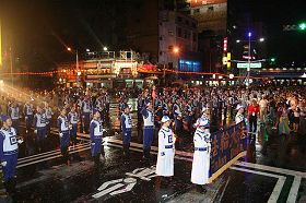![]() 二零零九年九月二日,台湾基隆中元祭放水灯游行,由二百多位法轮功学员组成的天国乐团在观礼台前表演。 |