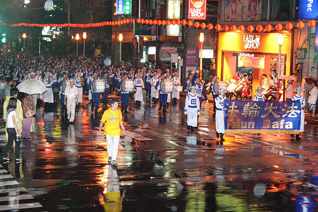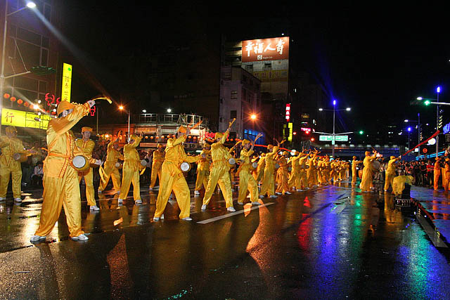 ![]() 由八十位法轮功学员组成的腰鼓队,首次在基隆中元节放水灯游行亮相。 |