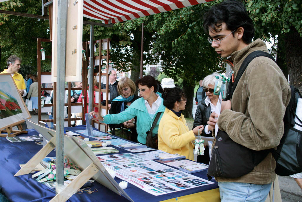 前来参加活动的人们被法轮功祥和的音乐和柔和功法所吸引,展位前的游客不断。法轮功学员繁忙而和善地接待着每一个询问的人,回答他们的疑问,满足他们的好奇心。