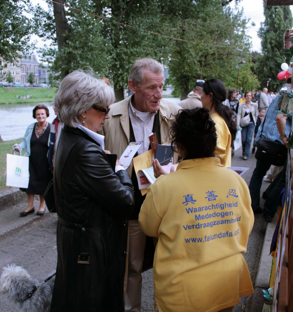 何女士和她的女儿来到法轮功展位前,告诉学员说:我们是专门来找你们的。你们有神韵艺术团演出的光盘没有?我们非常想看到这个演出,我们想买光盘。因为神韵在安特卫普市演出时,时间不适合我们观看,所以我们没能看到。