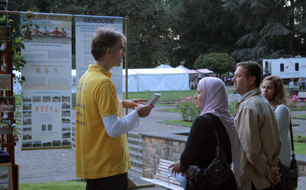 斯德范纳托先生和爱拉卡瑞女士(France Stevanato 和Soraya Elakari)听了学员对法轮大法“真善忍”的讲解后马上说:“中共一定不喜欢这三个字。谢谢你告诉我这三个字的意义。我要买《转法轮》这本书回去看。”他们留下了电子邮件地址,希望得到更多关于法轮大法的信息以及炼功点的情况。