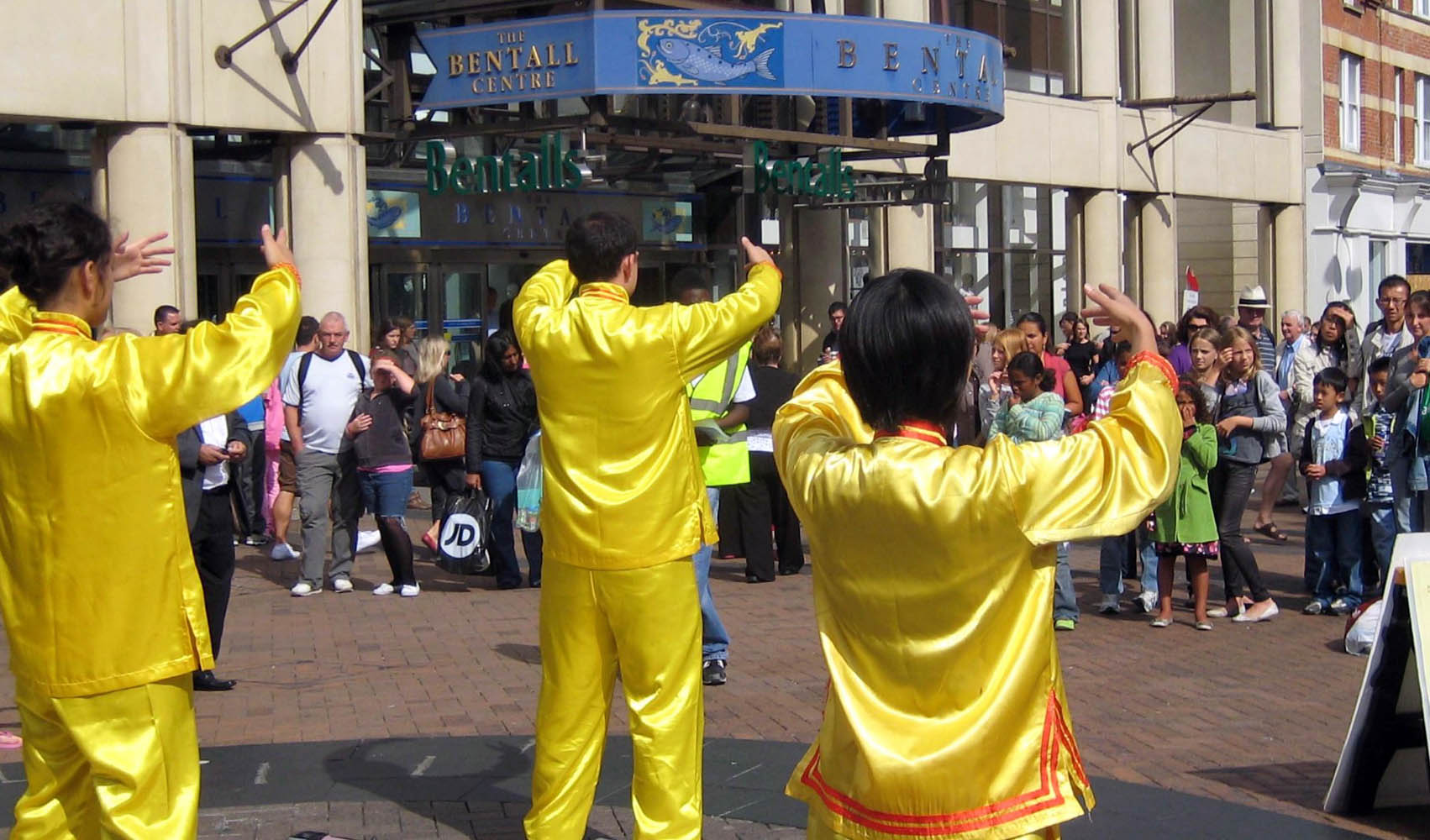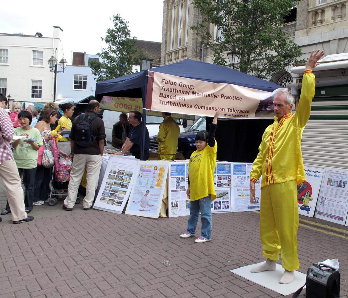 节日活动组织者安排法轮功学员在镇中心的广场上两次表演功法。学员身穿金色炼功服,伴着优美祥和的炼功音乐表演五套功法,吸引了大量民众驻足观看。肯思顿是个离伦敦市中心二十五分钟火车车程的大学城,有很多中国大陆留学生在这里学习,而在周日的观众中经常看到带着思索表情的华人面孔。