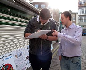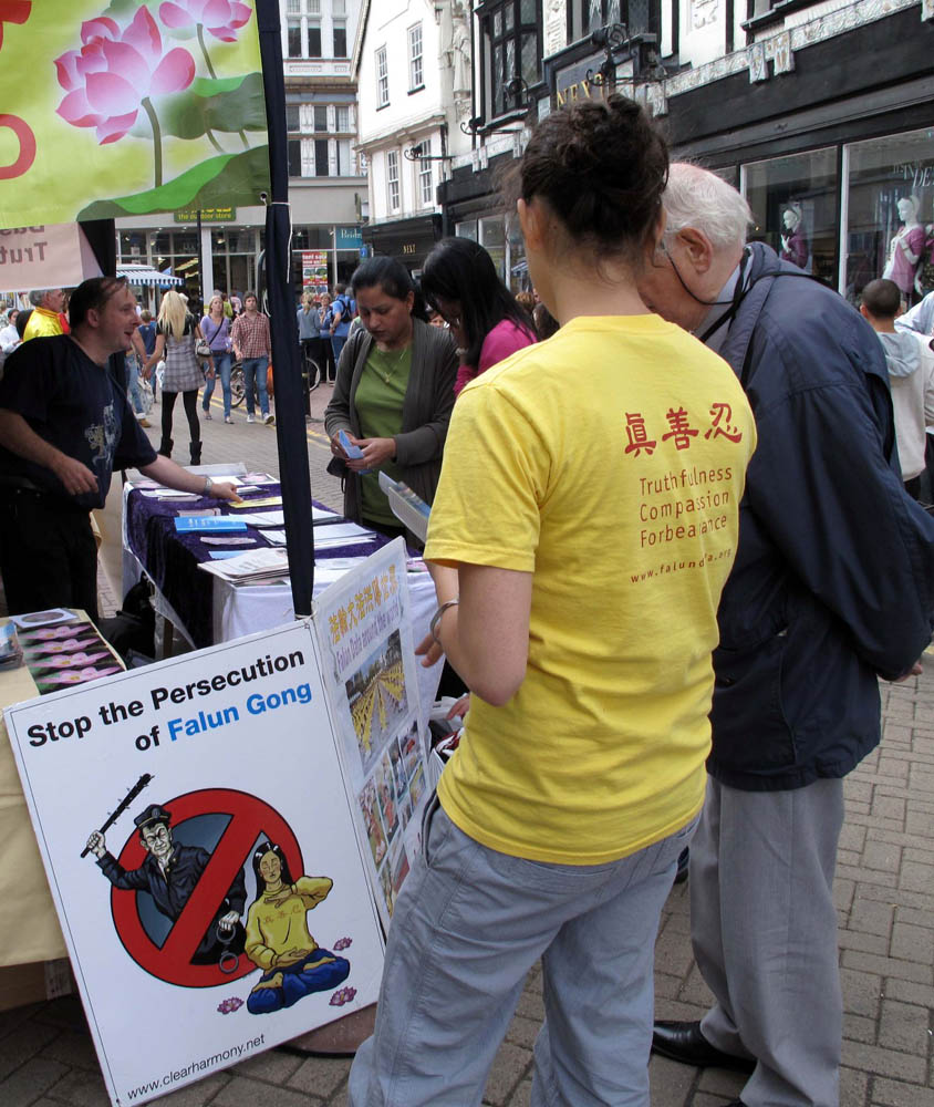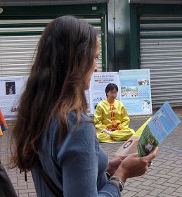 学员们注意到有一些人在真相信息台附近停留良久,或者走了又来,就是为了有机会多了解一些法轮功真相。一位中年英国男士在反迫害征签表上签字后离开,过了一会儿又来了,眼睛在桌子上的真相资料间仔细搜寻。这时一位学员递给他一个英文《九评共产党》真相光盘,告诉他看了这个能明白中共邪党为什么迫害法轮功,又给他找了一份讲真相的英文专刊报纸,接过这些真相资料后,这位英国人满意地离开了。