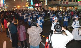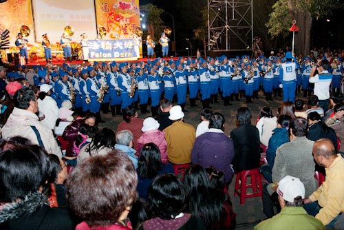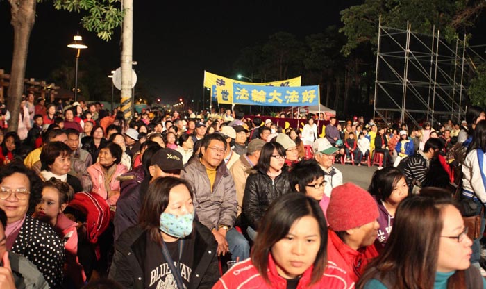 主办方在游行终点搭起了跨年晚会的舞台,天国乐团登台一连演奏了十二首乐曲,《法轮大法好》、《法鼓法号震十方》、《法正乾坤》、《送宝》、《佛恩圣乐》与《法轮圣王》等气势磅礴的乐音回荡在整个会场,更有充满节庆气氛的《欢乐颂》、《铃儿响叮当》及《普世欢腾》,嘹亮的鼓乐声响彻云霄,民众也随着欢乐的乐曲鼓掌叫好。与舞台上的天国乐团互相辉映的是当地学员在台下撑起的横幅“法轮大法好”,希望借此传达法轮大法美好的讯息给屏东民众。