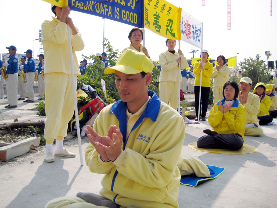 ![]() 法轮功学员在花车上展示法轮功功法 |