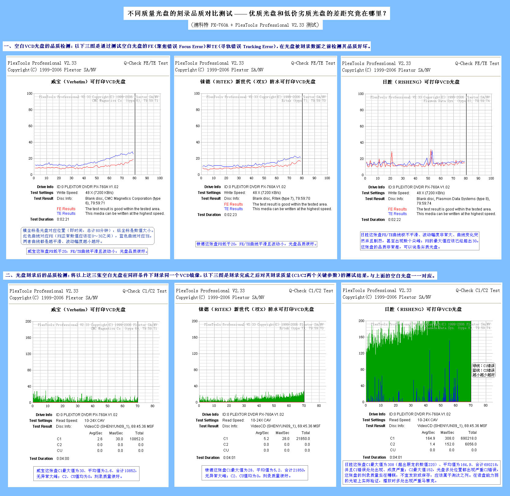 以下测试,选择了典型的优质光盘和低价劣质光盘,利用浦科特PX-760A刻录机配合PlexTools Professional软件,首先检测其空白盘片的品质,然后在同样条件下刻录VCD并检测各自的刻录质量。图片上有相应解释说明,不熟悉这方面知识的人也能理解,测试结果非常直观、质量差距的对比悬殊。