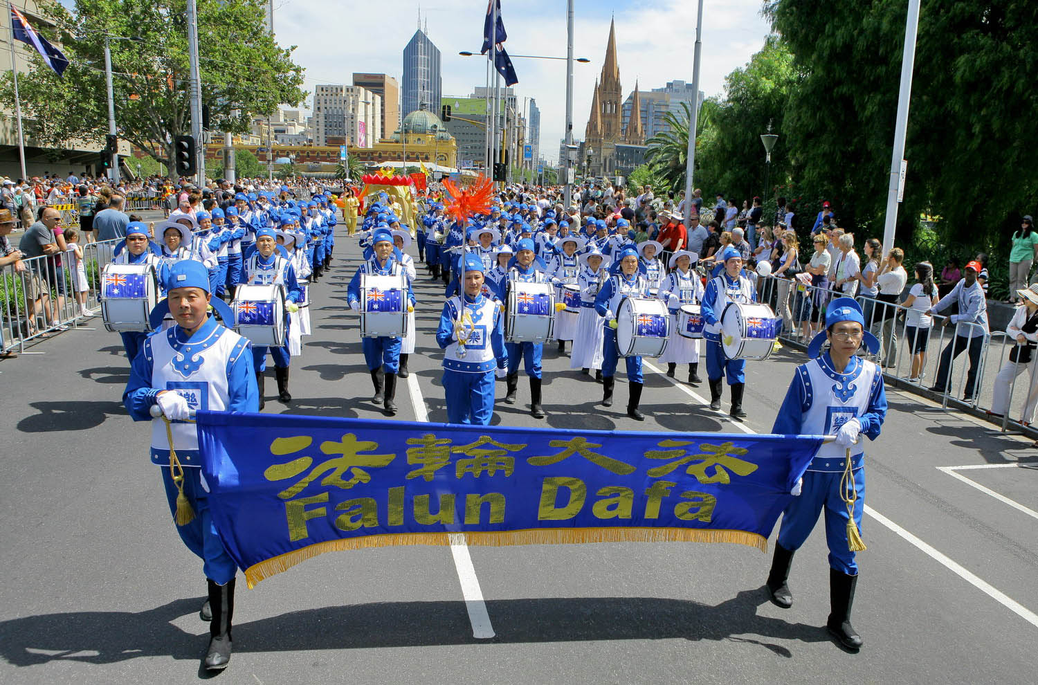 由法轮功修炼者组成的天国乐团走在法轮功的方阵最前面,游行队伍还包括穿着富丽典雅唐装的仙女们以及扇子舞表演队。在醒目的“法轮大法”横幅之后,乐团成员一路高奏“法轮大法好”、“法正乾坤”、“法鼓法号”等乐曲,威武雄壮,引来沿途数千观众的喝彩。