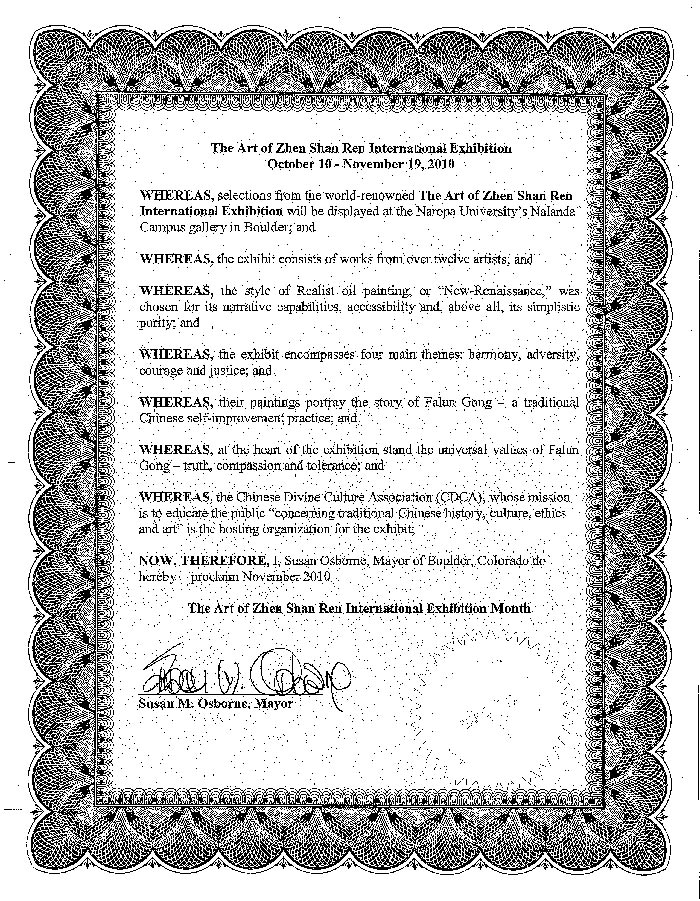 兹科罗拉多州博尔德市市长,苏珊•奥兹本褒奖二零一零年十一月为“真善忍画展月”
