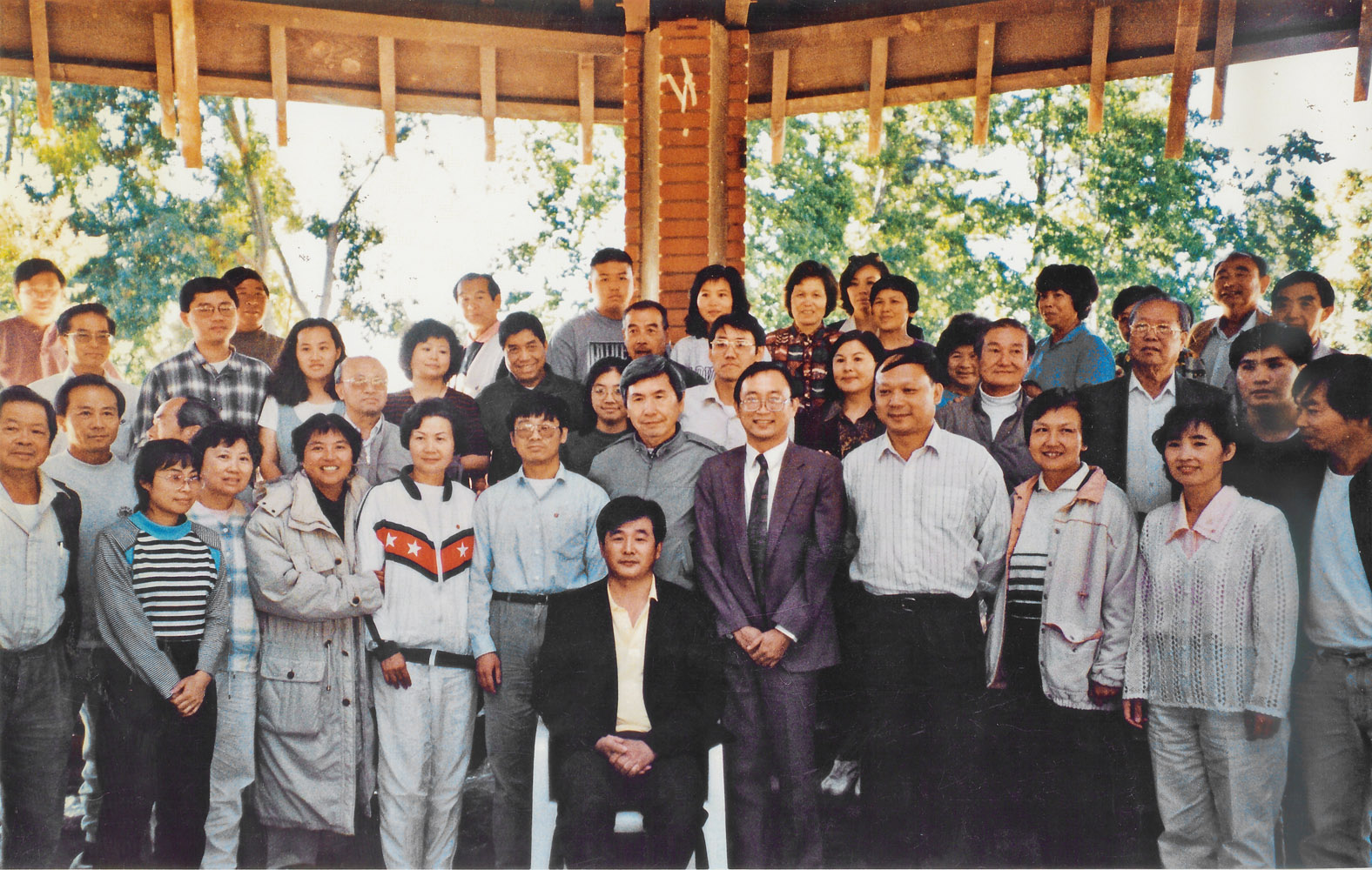 ![]() 一九九六年十月五日旧金山湾区学员和师父在奥德佳公园合影留念(此照片只是合影照其中的一张,当时来的人很多,围着亭子一圈都站满了,师尊是分批和学员合影。) |