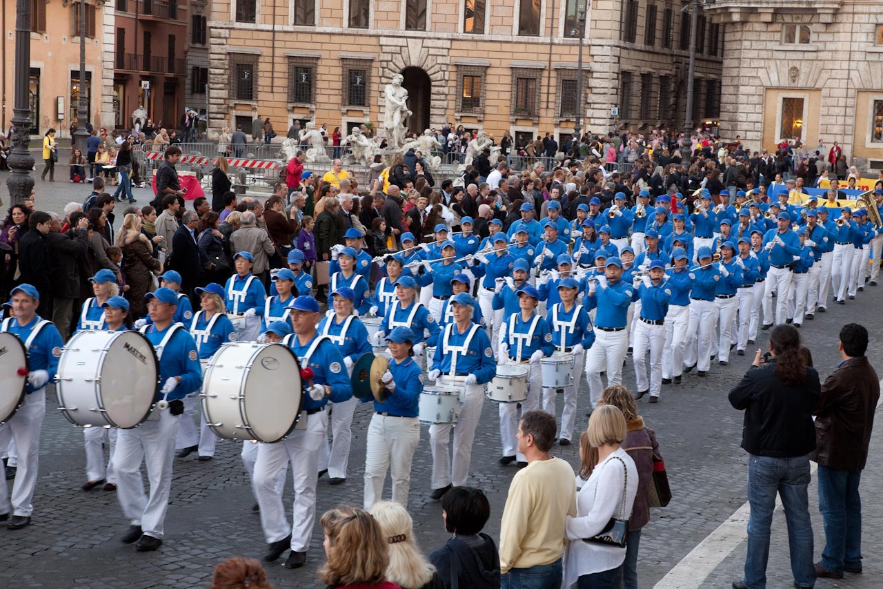 下午两点半,法轮功学员组成的游行队伍从罗马真言之口广场(Piazza della Bocca della Verità)出发,打头阵的是队形整齐的欧洲天国乐团。这一天是地中海沿岸典型的万里湛蓝晴空,天国乐团的乐手们蓝衣白裤,好象是天空的颜色融进了他们的衣服。接下来是身着金黄色炼功服的功法演示队,后面是八位身着粉色长裙古装的荷花仙女,她们手持莲花,面带微笑,随着《法轮大法好》的音乐变换着队形,轻柔的舞姿吸引了路人的目光。