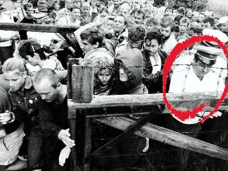 摄影镜头为当年的人潮留下了永久的定格:人们摩肩接踵的从开了口子的狭窄的边境栅栏通过,黑白照片的右侧,人群把两个身穿白色制服的匈牙利警察挤到了铁丝网前,但他们无动于衷,低着头往地上看,对人潮视而不见,嘴角似乎还露着笑意。