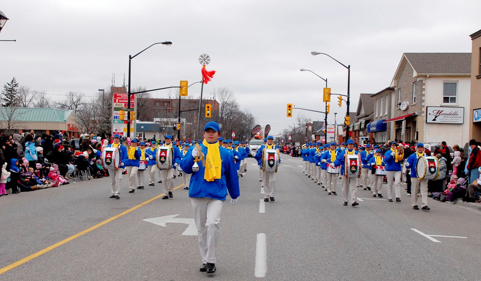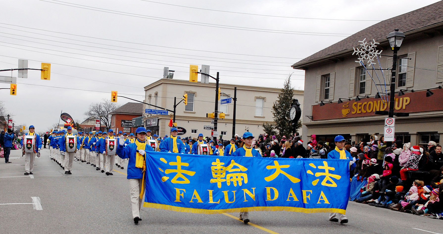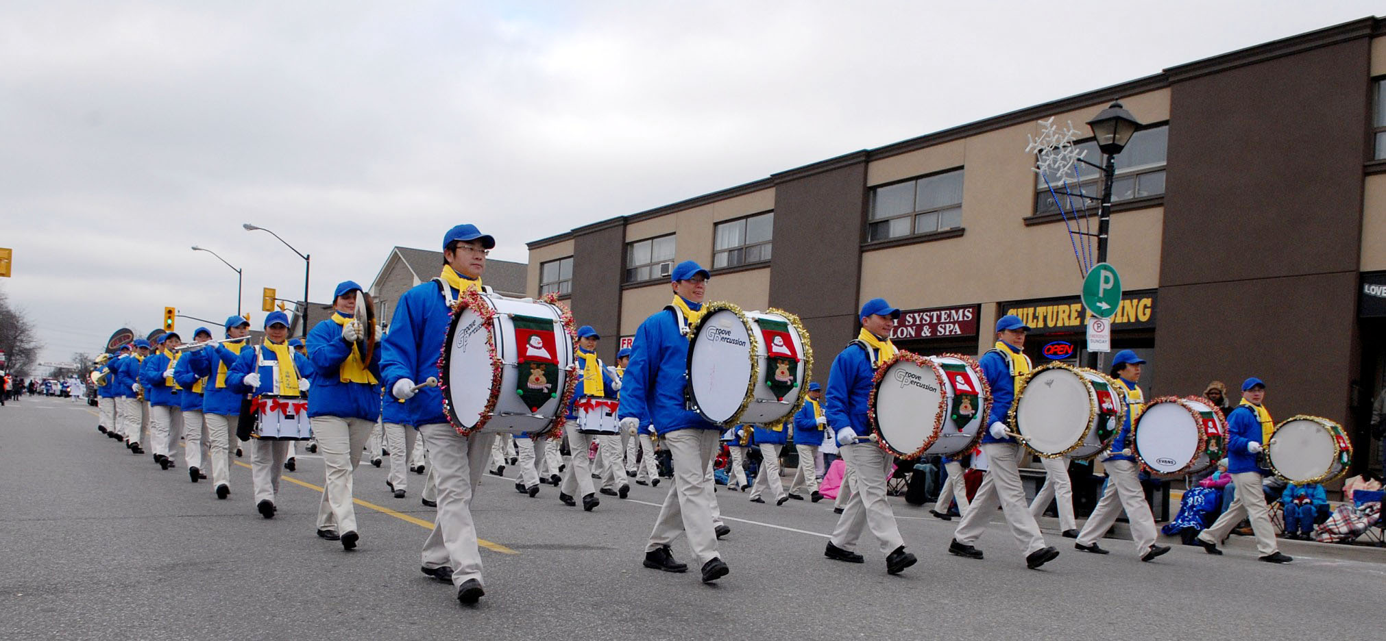 十一月二十七日多伦多的万锦市迎来了圣诞节的第一场雪。尽管天气很冷,但仍有很多热情观众出来观看游行。天国乐团的队伍被主办单位作为压轴队伍,排列在最后出现的圣诞老人的前面。天国乐团排队等待出发等了近两小时,但一出发天气就变清朗,太阳也出来了。有观众看到天国乐团后面跟着出现的圣诞老人,就兴奋地说:“谢谢他们把圣诞老人给带来了!”