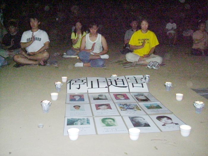 二零零四年七月二十三日晚,日本法轮功学员在东京中使馆前静坐,同时在使馆附近公园举办烛光守夜,揭露中共对法轮功学员的残酷迫害,悼念被迫害致死的法轮功学员。