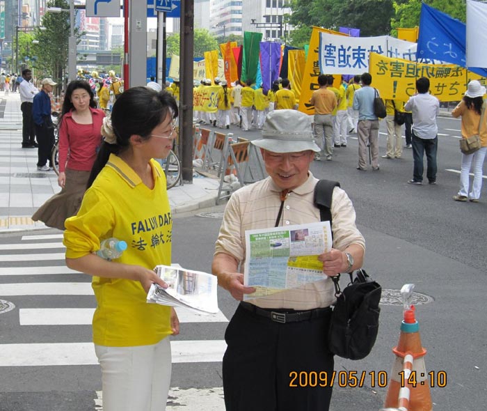 一九九九年七月二十日中共开始了对法轮功的残酷迫害,日本法轮功学员连续近十年在东京中使馆前抗议,每年的“四二五”和“七二零”都举行反迫害的集会游行,经常举办“真善忍国际美展”,并在秋叶原电器街及东京入国管理局前等经常有中国人出入的地方坚持向中国大陆来的旅游团和在日中国人、日本民众发真相资料、讲清法轮功真相。