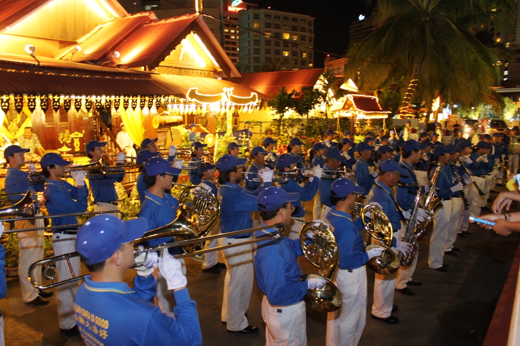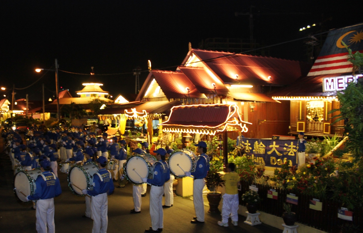 参加演出的八十多位天国乐团成员是在二零一零年马来西亚法轮大法修炼心得交流会的前一天,到马六甲几个景点演出,把法轮大法的美好带给当地民众。在这之前,天国乐团受邀到马六甲广场进行了约半个小时的演出。接着,天国乐团前往景色宜人的马六甲河畔景点进行演奏完毕后,即前往甘榜摩登村长屋前进行了将近一小时的演奏。