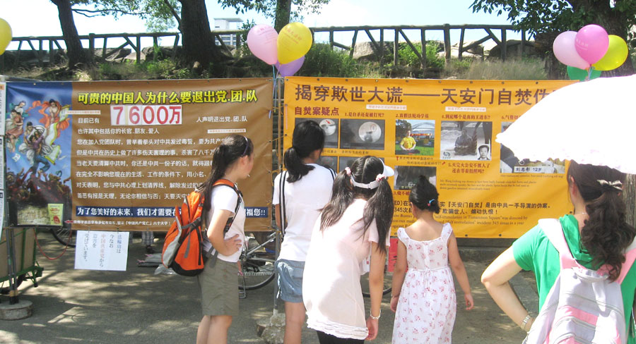 自从大法在西日本弘传以后,在这一著名的旅游景点又出现了一道亮丽的风景,那就是法轮功悠扬悦耳的炼功音乐、祥和的炼功场面和摆放整齐的真相展板。法轮功学员常常在这里真诚地向人们讲述法轮大法的美好,并揭露中共编造谎言欺骗民众、残酷迫害法轮功的事实真相。